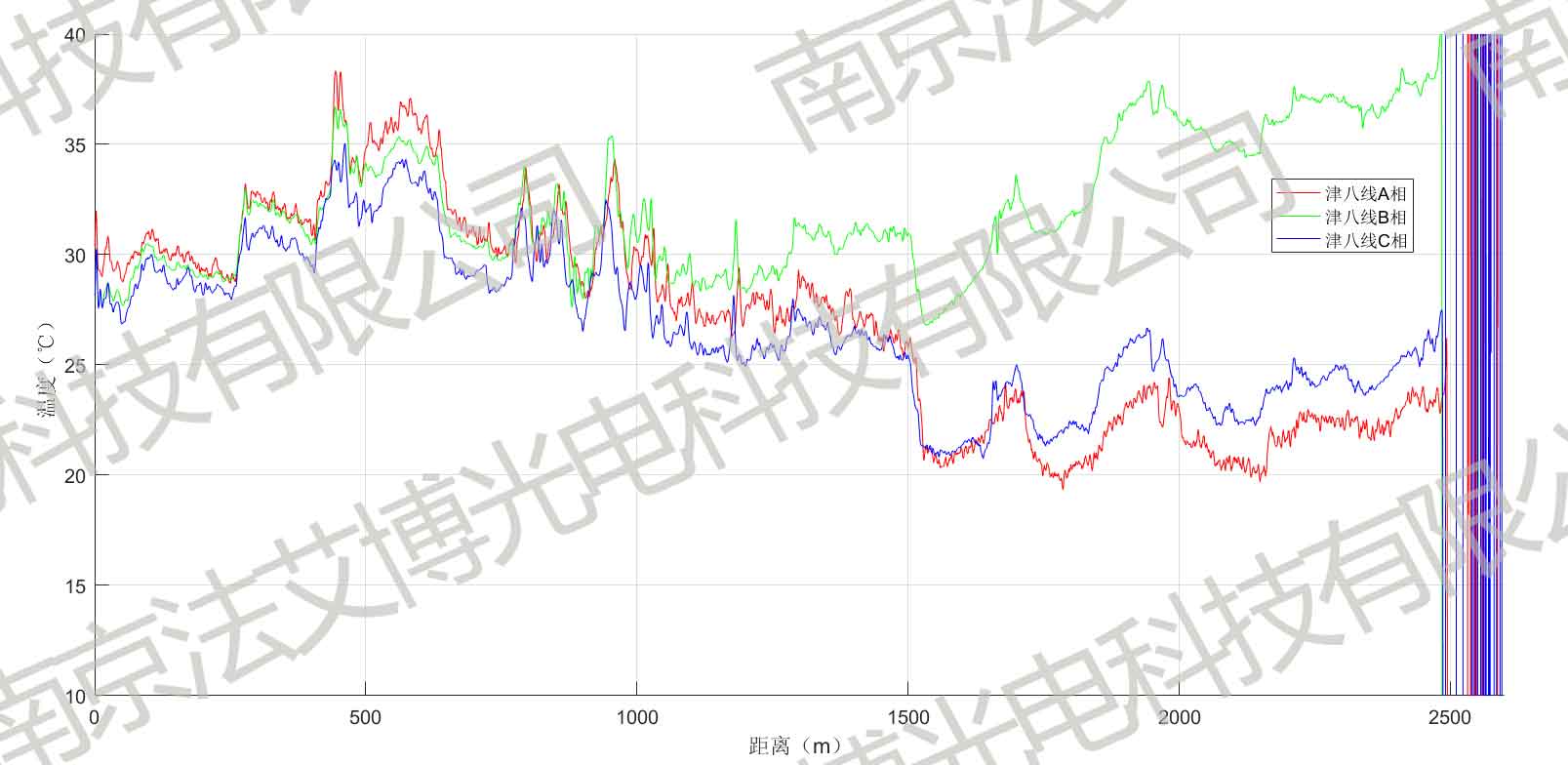 通過為期2天的現場測試與后續的數據分析,我司給出了各相線路的對應關系,并對線路損耗、異常升溫等潛在故障風險進行了評估,提交了線路整改建議。天津電纜公司對我司提供的分布式光纖傳感系統有高度的評價,認為該技術的引入能夠快速準確地識別并定位潛在風險,對于提高電纜運維水平大有助益,后續將考慮引入該型設備做24小時在線監測。