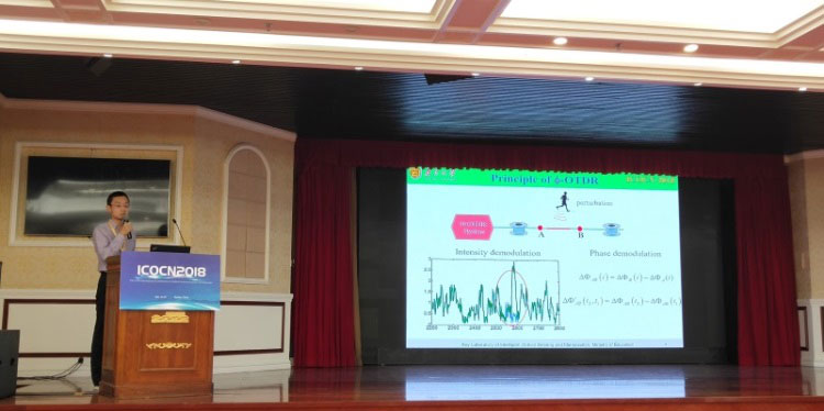 張旭蘋教授、王峰副教授受邀參會并做了邀請報告。他們分別就DAS傳感系統(tǒng)的應(yīng)用、弱光柵陣列分布式光纖傳感系統(tǒng)的最新進(jìn)展和成果向參會人員做了報告,引起了參會人員的廣泛關(guān)注。